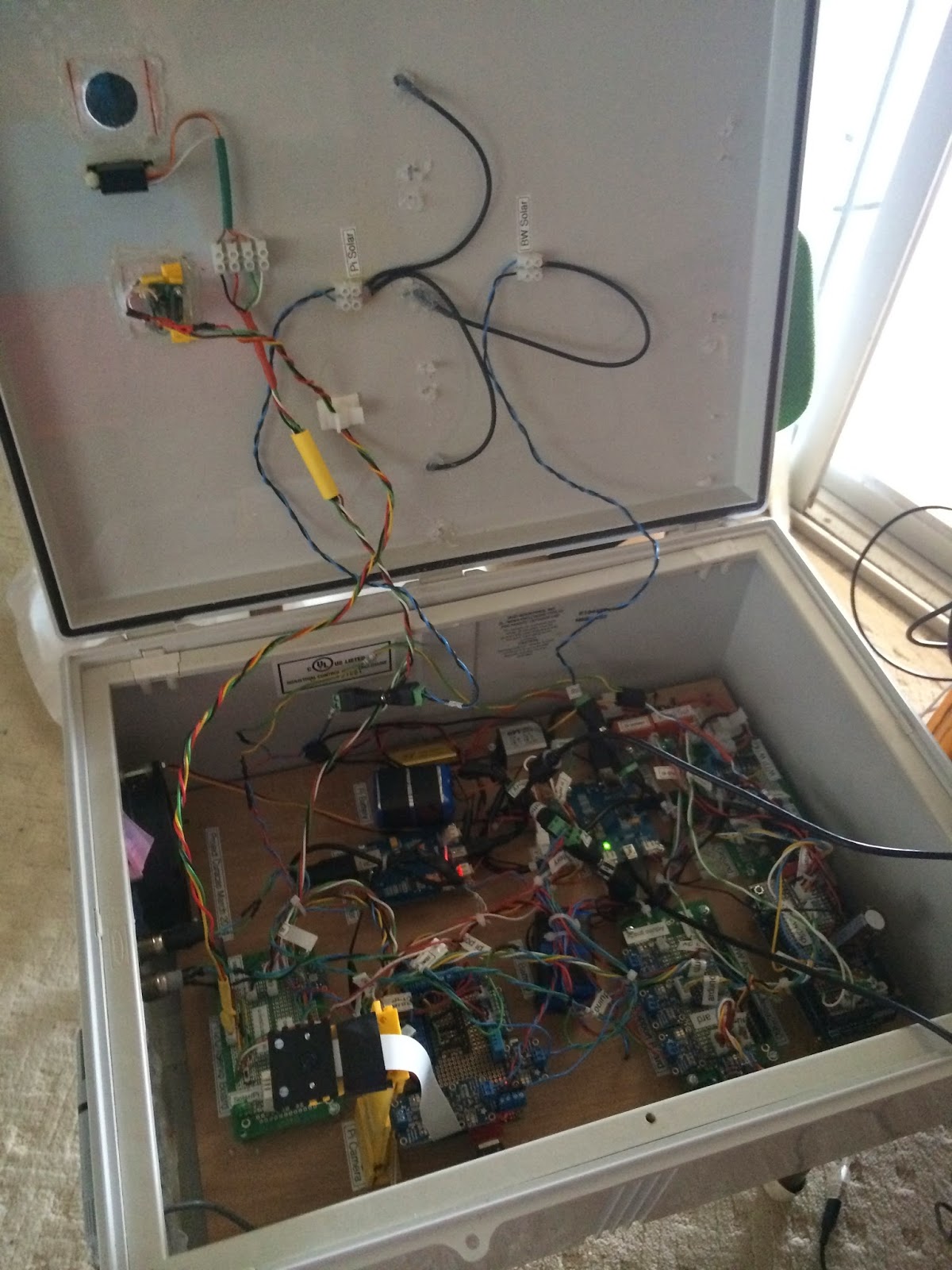 4) The wind turbine worked as predicted by our models. We switched on the turbine at night to provide a trickle charge to the main computer. We got about 60 - 90ma of current at 15MPH. No where close to the 200-300ma it takes to run the Pi. However, a wind storm came through and destroyed the turbine about a week after installation. Note that the turbine popped out of the stand and throughly destroyed itself. We think that is was a sympathetic vibration with a particular wind speed (much like the "Galloping Gertie" Tacoma Narrows bridge) since we observed that the stand was flexing in the wind. We will either prevent the next turbine from popping out or stiffen the stand to prevent the flexing or possibly both.
